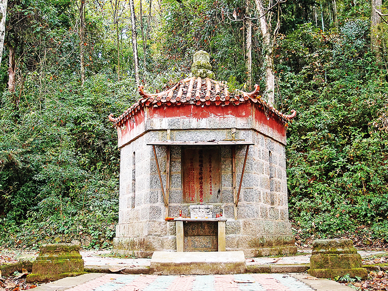 ‘조동조정(曹洞祖庭)’이라 새겨져 있는 산문 옆에는 한 그루 작은 소나무가 있다. 원래 높이가 10m가 넘었고, 둘레가 13m에 이르렀지만, 2005년 태풍이 불 때 벼락을 맞았다. 이듬해 봄 기적적으로 다시 살아났지만, 줄기 껍질이 조금밖에 남아 있지 않다. 그렇지만 지금은 나뭇잎이 무성하다. <오등회원(五燈會元)>의 기록에 따르면, 이 소나무는 동산양개 제자 청림 사건선사가 심으면서 “높이는 3척(1m 정도) 남짓인데, 나뭇잎의 푸름이 파란 풀을 덮는구나. 어느 시대 사람들이 이 소나무의 늙음을 볼 수 있을까?”라는 게송을 지었다고 한다.