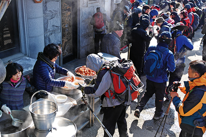 지난 2월11일 법당에서 기도를 올리는 목탁소리가 은은한데 등산객들은 삼삼오오 모여 담소를 나누며 무언가를 기다리고 있었다. 후원 한쪽에서 큰 가마솥에 장작불을 피워 국수를 삶아내는 동안 봉사자들은 김치와 야채를 잘게 썰어 수북이 쌓아 놨다. 정각 12시가 되자 공양시간을 알리는 목탁이 울린다. 등산객들은 어느새 길게 줄을 서 있었다. 어림잡아도 300명이 넘는 사람들이 익숙한 듯, 절마당을 몇 바퀴 돌아 줄을 만들었다.