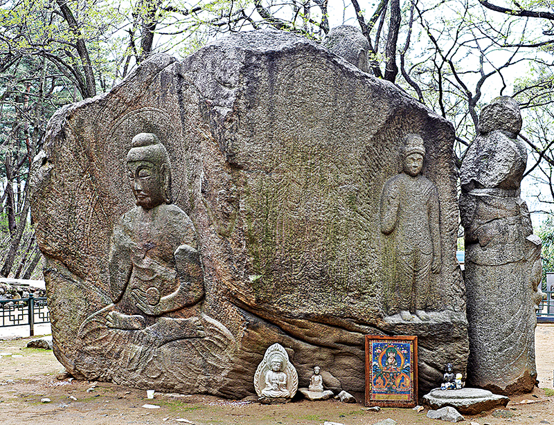 굴불사지 사면불상은 통일신라시대 8세기 전반에 조각됐다. 동면: 2.6m, 서면: 3.51m, 남면: 1.36m, 북면 1.61m.